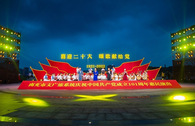 7月1日晚,由四川省南充市文化广播电视和旅游局、顺庆区人民政府主办,市文化馆、顺庆区文广旅局承办的“喜迎二十大·颂歌献给党”南充市文广旅系统庆祝中国共产党成立101周年惠民演出在顺庆区滨江阳光广场上演。来自市纪委监委、市文化馆、四川省(南充)大木偶剧院、市川剧团、市杂技团、群众文化团队等的300余名演职人员为市民奉上了一场“视听盛宴”。