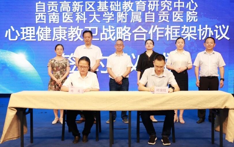 西南医科大学附属自贡医院副院长叶安红与高新区基础教育研究中心主任杨奕签署《心理健康教卫战略合作框架协议》。高新区四级调研员张佩琳、西南医科大学附属自贡医院院长谭友果以及汇东实验学校、蜀光绿盛实验学校、汇南实验学校、板仓实验学校的校领导共同见证签约时刻。