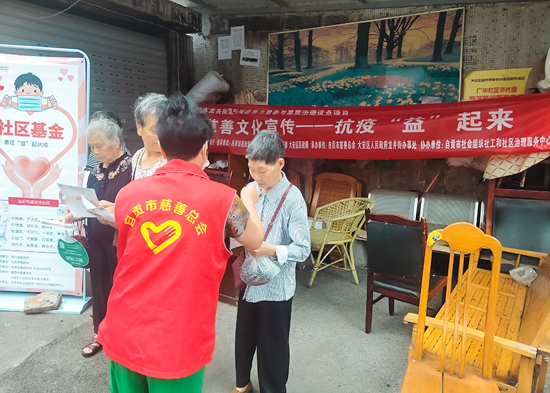 为宣传疫情防护知识,宣传慈善文化,营造良好、健康的社区慈善文化氛围。7月22日,四川省自贡市龙井街道引导慈善力量参与基层治理试点项目在龙井街道广华社区华光里小区开展“抗疫‘益’起来”慈善文化宣传活动,宣传社区基金、疫情防护知识200余人次。
