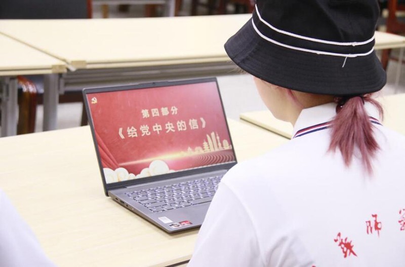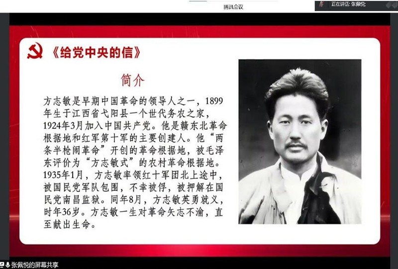 而今天主讲这个故事的是队员张佩悦,她是我们实践队伍里年龄最小的一名成员,还缺少讲台经验的她,在正式上课之前显得十分紧张。她很担心自己上课的内容是否会过于枯燥,不断的去寻找更多有关方志敏的历史资料去补充自己的课堂内容。一次次的试讲,一次次的发现问题并不断改正,并且与前两天上完课的其他实践队员们,积极交流,向他们学习经验,以求让自己的课堂更加生动,能够真正讲好方志敏的故事。我们这一次选择了方志敏《给党中央的一封信》作为引入,来讲述方志敏入狱的那段艰苦岁月。在课堂上,张佩悦选取了信中最能够体现出方志敏精神的几段信,用坚毅的语气向同学们讲述。仿佛将大家一起带回到了那个年代中,置身于狱中黑暗的牢房中有一个小桌,点点微弱的烛光,照亮着方志敏的信,也照亮着他对党的忠诚和对国家的拳拳爱国之心。