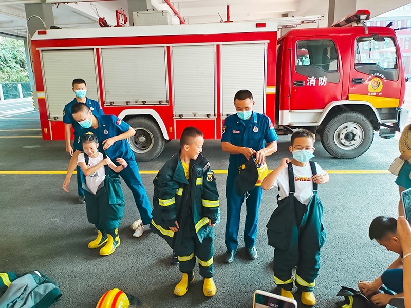第三部分是体验消防服装,先由消防员示范,消防服的厚重也没有阻挡小朋友们的热情,他们积极参与、踊跃体验,体会到了消防员工作的辛苦。活动结束之后,小朋友们和家长一同与消防员合照,作为本次活动的留念。