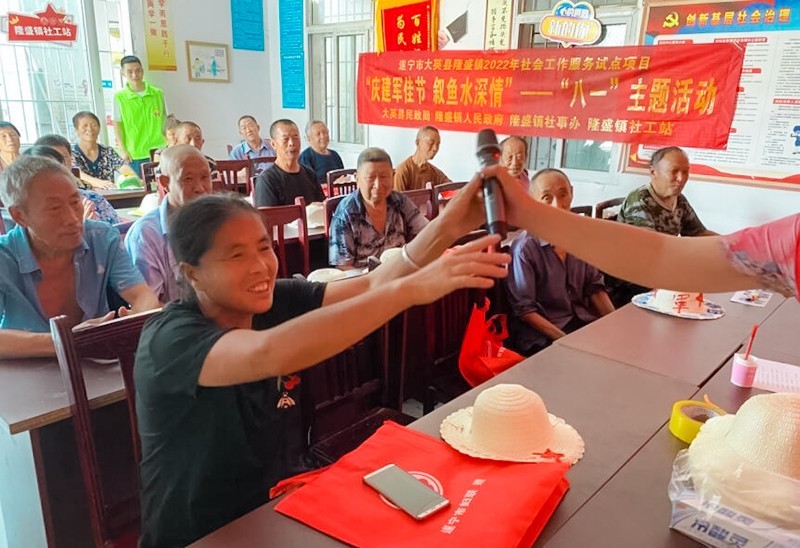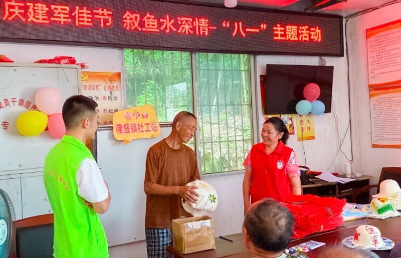 看今朝辉煌,忆峥嵘岁月,用红心铸就红星。今年是中国人民解放军建军95周年,为弘扬拥军优良传统,让退役军人充分感受到党和政府的关心关爱。8月1日,在四川省遂宁市大英县民政局的指导下,隆盛镇人民政府,社会事务办的支持下,遂宁春晖社会工作发展中心驻隆盛镇社工站以“庆建军佳节 叙鱼水深情”为主题组织了隆盛镇五龙桥村20名退役军人了开展“八一”建军节庆祝活动。