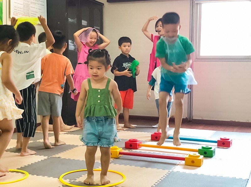 接下来早教老师对孩子们分别进行体能、智能游戏培训。老师先带领着大家坐好,给小朋友们讲解游戏的规则和玩法。引导大小朋友们双脚并拢向上跳跃,通过玩呼啦圈赛道游戏和纱巾运球游戏,提升儿童运动能力的发展,以及肢体协调能力,从而提升了宝宝专注力。