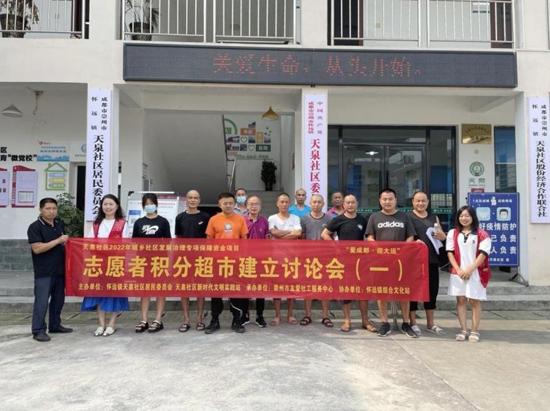 为加强志愿者队伍建设、制定健全的志愿者团队管理制度,不断提升志愿服务水平。8月26日,由四川省崇州市怀远镇天泉社区居民委员会主办、崇州市友爱社工服务中心承办的怀远镇天泉社区2022年城乡社区发展治理专项保障资金项目——志愿者积分超市建立讨论会(一)在天泉社区顺利开展。