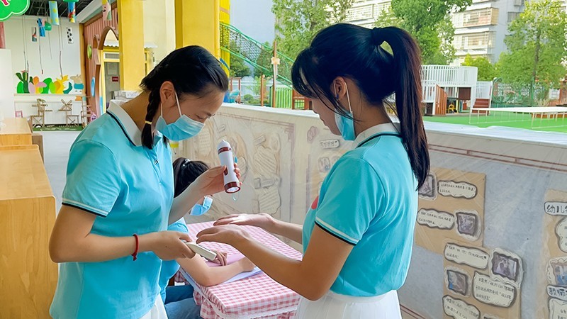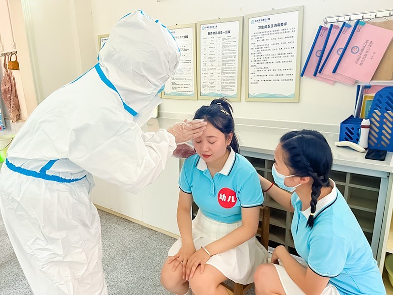 在教学活动中,发现有一名幼儿出现咳嗽、呕吐的现象,教师马上为幼儿测量体温。发现幼儿的体温异常后,老师马上规范为幼儿佩戴好口罩,护送幼儿到隔离室。保健老师也对发热幼儿复核体温,与家长取得联系,详细询问并核对了孩子的临床症状及接触史。园领导马上向上级部门汇报情况,安全防控后勤组跟及做好幼儿园安全防控工作。该幼儿离开后,消毒组人员立即穿上防护服对疑似幼儿活动过的区域、使用过的物品进行了全面的消毒清洁。
