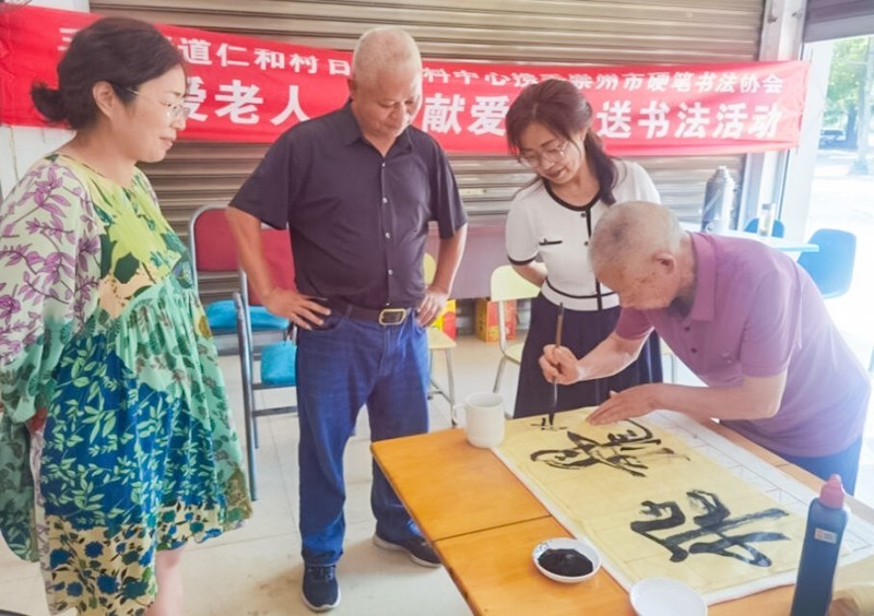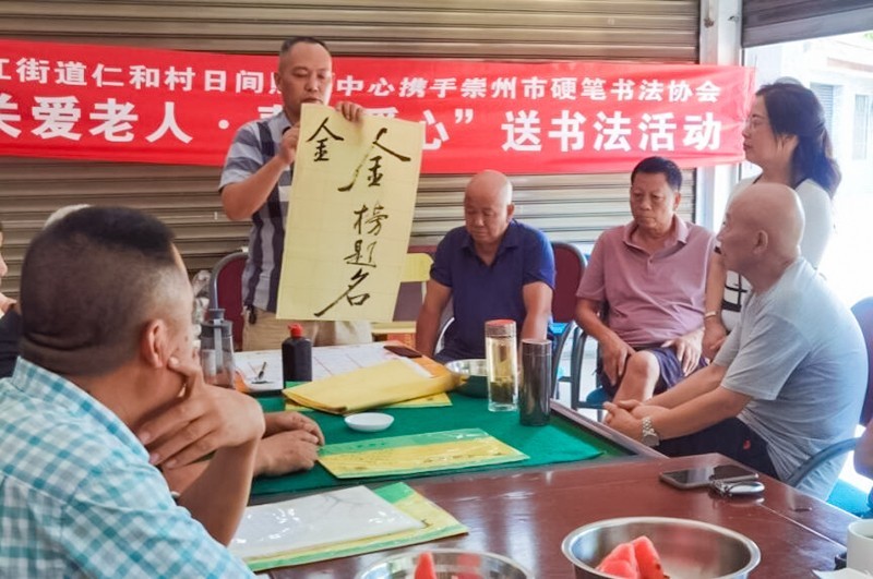 8月25日下午,四川省崇州市三江街道王桥村日间照料中心邀请崇州市硬笔书法协会平超等四位老师,共同开展“关爱老人,奉献爱心”为主题的送书法活动。全村20余位老年朋友参加老师们的书法知识讲座与书法互动。
