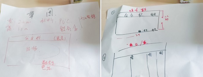 公告栏就如一个组的门面,它需要一定的设计感来突显。为此我们在各个小组成员积极并热烈的讨论;村委会、党员、村民各方也发表了各自的意见下,最终我们绘制出了6份草图,制定了图纸的大纲。