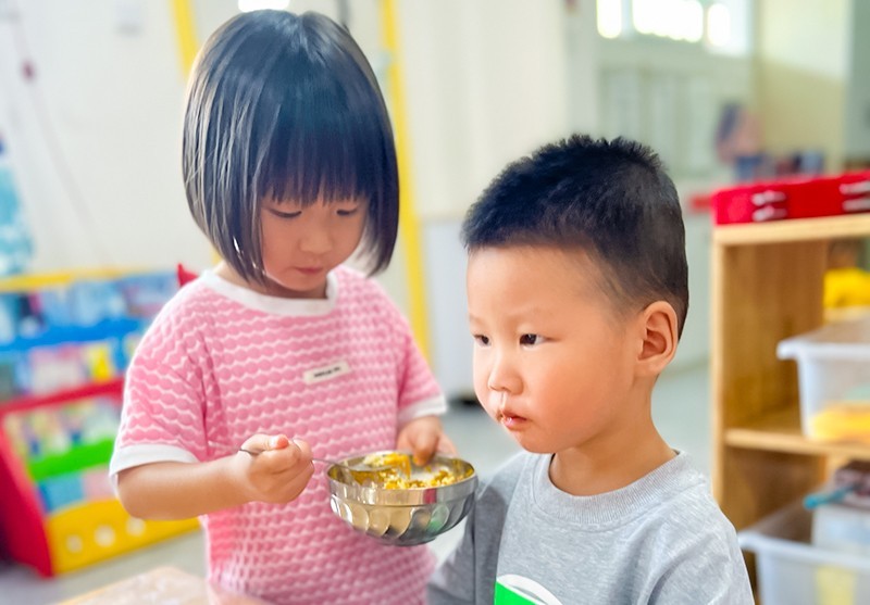 在幼儿园里,孩子们见到了阔别已久的小伙伴,大家兴高采烈地分享着假期的奇闻趣事,一起在幼儿园放肆地奔跑、愉快地玩耍,幼儿园又变成了欢乐的海洋。大班的孩子们用“大带小”的实际行动证明着自己的成长与进步,孩子们安抚着入园焦虑的小班幼儿,给弟弟妹妹喂饭、穿衣、擦拭眼泪,像一个“小大人”一样照顾着他们。