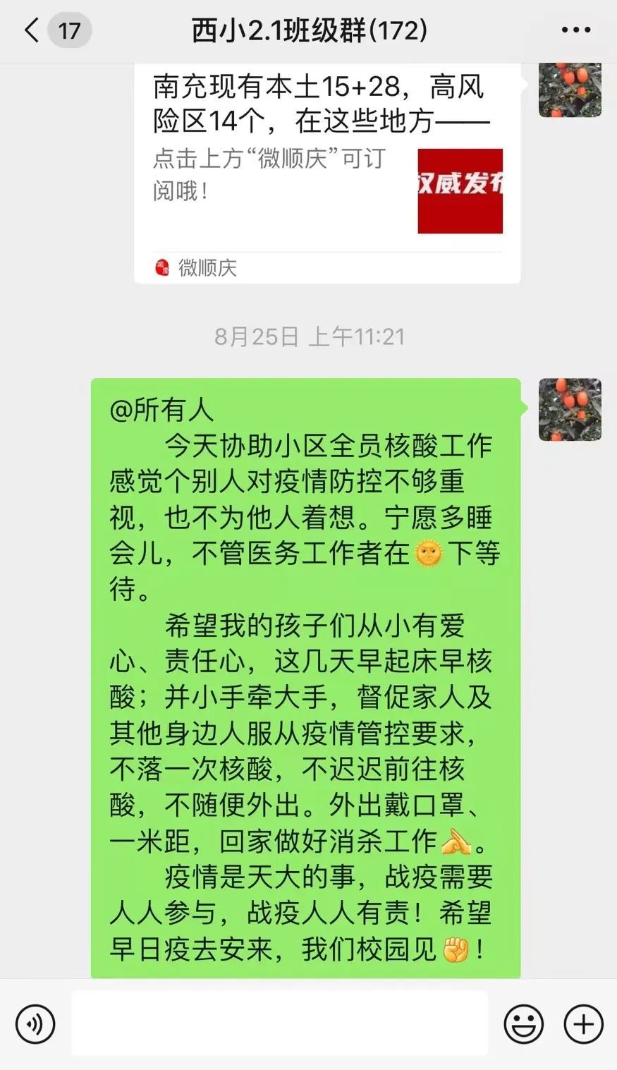 师者本心,冶情铸魂。在防疫工作中,范老师以春风化雨润物无声的情怀树立党的好形象,厚植爱心,传递责任。小朋友早早排队核酸检测,她发自肺腑地称赞:“宝贝真了不起,这么早就起床了!队也排得这么好!”离校不离防控,停学不停育人。范老师常常给她的孩子们分享抗疫中那些感人的故事,教导他们从小有爱心,有责任心,号召他们小手牵大手,帮助身边人服从防控要求,自觉参与核酸检测。她也不忘在业主群、朋友圈宣传抗疫,利用休息时间报道小区居民齐心协力抗疫事迹,凝聚人心,汇聚力量,共赴美好。她明白“为党育人,为国育才”的初心和使命,不仅践行在三尺讲台,践行在身正垂范的行动中,也践行在生活的点滴里。