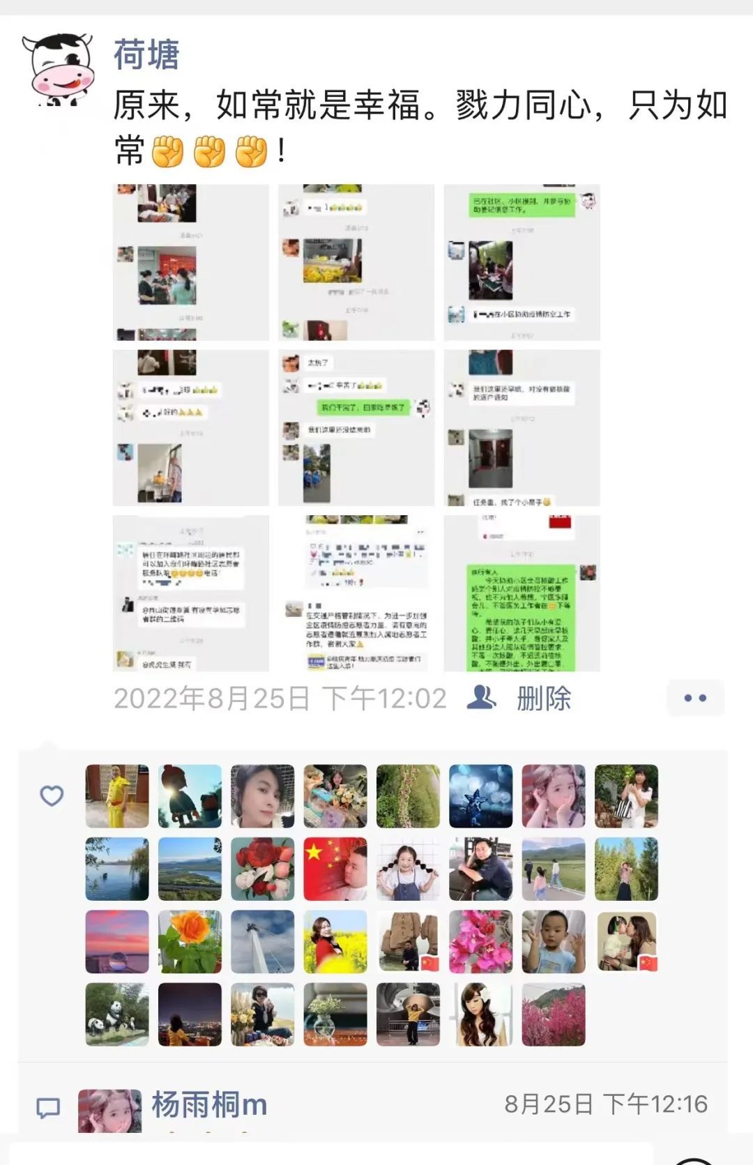 师者慧心,聚力前行。因所居小区封控,范老师服从社区安排,留在小区协助静态管理。面对繁杂的工作及陌生的队友,她积极思考,主动作为,携手市文化馆副馆长于静、华凤学校教师聂梦影,组织大家商议策略。在群策群力中形成了科学高效信息录入做法、梳理出了不漏一户不遗一人的快速排查措施、议定了消杀管控办法。她汇聚力量,建群、分工、协调……面对疫情,齐心是最好的药方。一群人,一条心,一件事,联防联控、群防群治战线迅速形成。小区防控工作有条不紊,防疫堡垒高高筑起。他们成了小区抗疫的“硬核力量”。