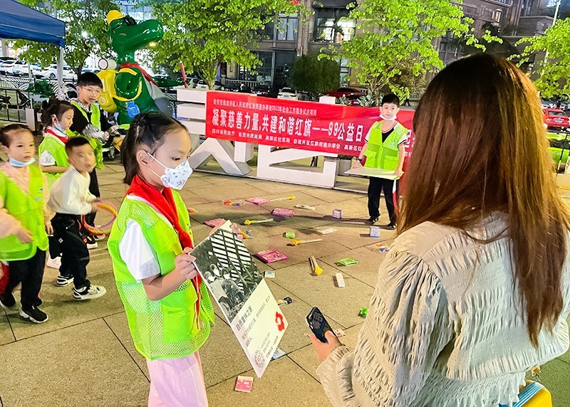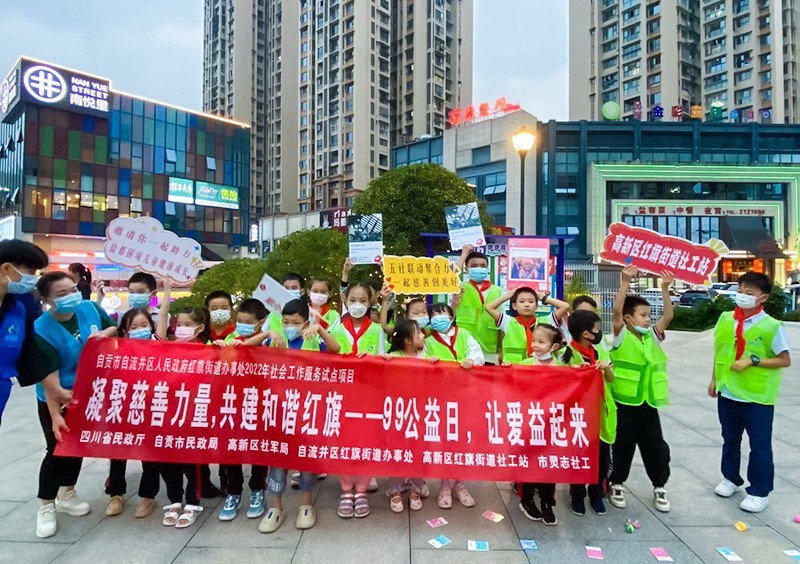 为积极响应9·5“中华慈善日”的号召,呼吁广大居民积极参与慈善事业,力所能及参与募捐,贡献自身力量,接力奉献爱心,传递凝聚正能量。9月9日,由四川省民政厅支持、自贡市民政局、高新区社军局指导、自流井区红旗街道办事处主办、自贡市灵志社会工作服务中心承办的自流井区红旗街道办事处2022年社会工作服务试点示范项目“凝聚慈善力量 共建和谐红旗”——99公益日,让爱益起来慈善募捐活动在南悦里广场开展。共有青蓝先锋队员22人参加,筹集善款600余元。
