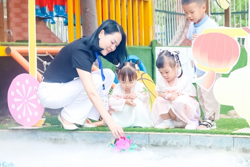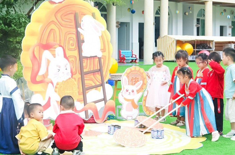 该园通过“品中秋”、“赏中秋”、“嬉中秋”三个环节开展了中秋奇妙游园会。孩子们在月兔拔萝卜、玉兔投壶、制作冰皮月饼、彩绘月球、兔子灯手作、莲花灯祈福、赏花灯猜灯谜等活动中亲身体验、直接感知,更加深刻的感受中国传统文化的源远流长,增加对中秋节美好寓意的理解。