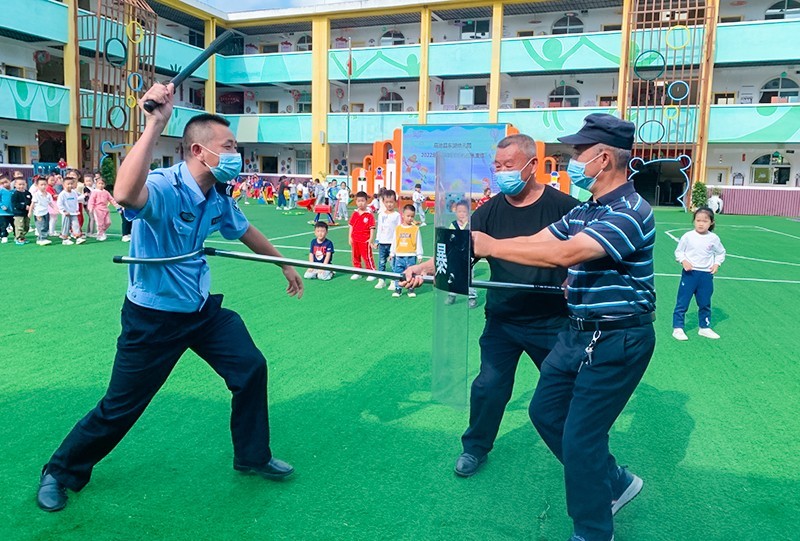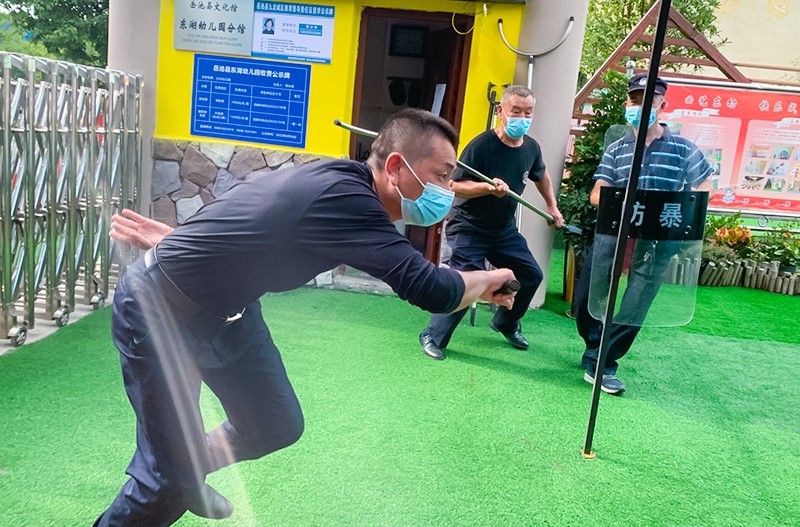 演练活动开始前,城东派出所民警先对幼儿园的安保人员进行了反恐防暴知识的宣传教育。随后,组织幼儿园安保小组进行相关技能培训,现场示范了钢叉、盾牌等防护器械的使用方法。