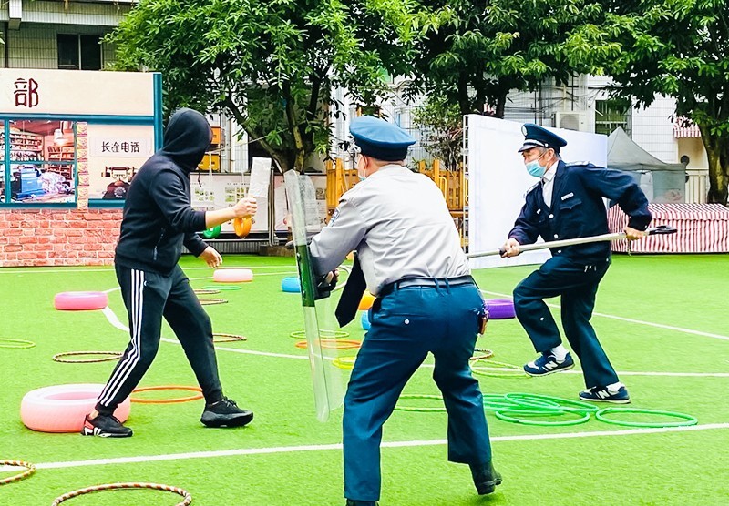 上午10:00钟,幼儿在操场进行户外游戏时,一名“歹徒”(由教师扮演)手持凶器强行闯入幼儿园,该园门卫和保安发现情况后立即手持防暴器械上前阻拦并迅速报警,安全处随即拉响警报。该园迅速启动了《岳池县示范幼儿园反恐防暴应急预案》。