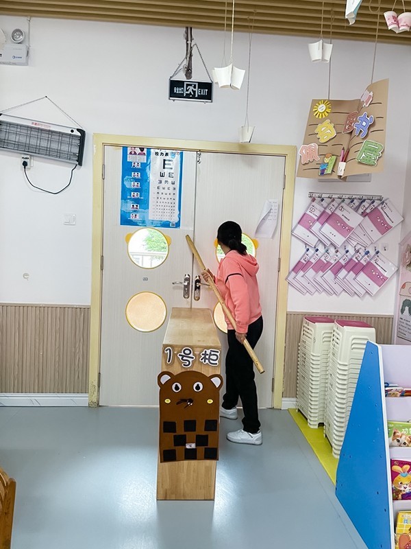 幼儿在老师的组织下,全部迅速撤离到就近教室,躲在教室的角落等隐蔽地方,老师立即关闭门、窗,将桌椅等障碍物放置门后,并手持防暴棍以防歹徒进入。与此同时,幼儿园应急小组及民警人员立即上前与“歹徒”展开搏斗,三分钟后将“歹徒”成功制服。
