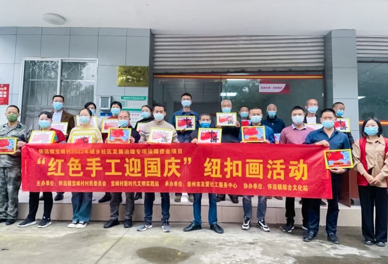 为营造良好的爱党爱国浓厚氛围,丰富社区村民的文化生活,激发社区村民的民族自豪感。9月28日,由四川省崇州市怀远镇宝峰村村民委员会主办、崇州市友爱社工服务中心承办的怀远镇宝峰村2022年城乡社区发展治理专项保障资金项目——“红色手工迎国庆”纽扣画活动在宝峰村顺利开展。