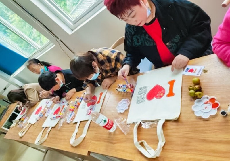 共同制作美丽的环保袋,通过行动减少社区环境的污染,向祖国献上一份贺礼,共同祝愿祖国的明天更美好是此次活动的主要目的。而后,社工志愿者分发了提前准备好的颜料套装以及帆布包,紧接着,社区居民们拿着画笔认真仔细地涂色,有参照所给模板上色的,也有发挥想象随性上色的。经过半小时的涂色,一款款色彩缤纷、象征着祖国美好的帆布包就“出炉”了。