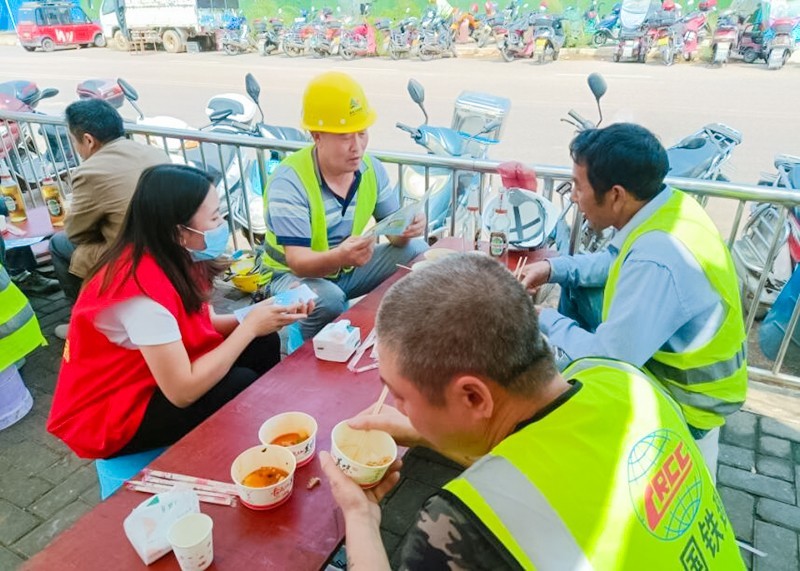 志愿者们头顶骄阳,设置宣传点位,摆放防艾知识、防艾政策等宣传折页、小礼品,调试设备播放《科学防艾》音频,活动随即有条不紊的进行。乘着午餐间隙,志愿者通过发放防艾宣传折页、现场讲解向工友们讲解艾滋病的危害及防治知识,掌握艾滋病的传播途径,加深流动人口对艾滋病了解与防治。