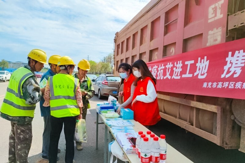 为积极推动针对流动人口的防艾宣传,提高工地作业人员对艾滋病的知晓与防范意识。9月29日,在四川省南充市高坪区疾病预防控制中心的指导下,高坪区志愿者协会组织志愿者在“碧桂园•玖玺台”“科华•云映天璞”施工场外开展了防艾宣传活动。