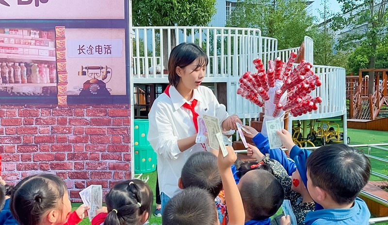 用在游戏中赢取的纸币到时光小卖部各自挑选自己喜爱的小零食,跟好朋友们坐在操场上,一边晒着太阳一边享受美食,十分惬意。孩子们在感受老一辈人的生活后,更真切体会到了祖国的发展逐渐日益强大。