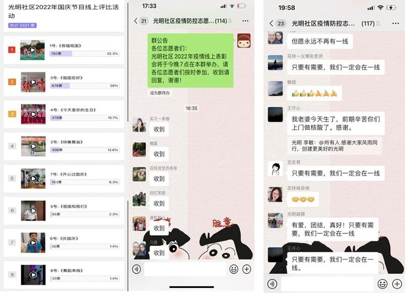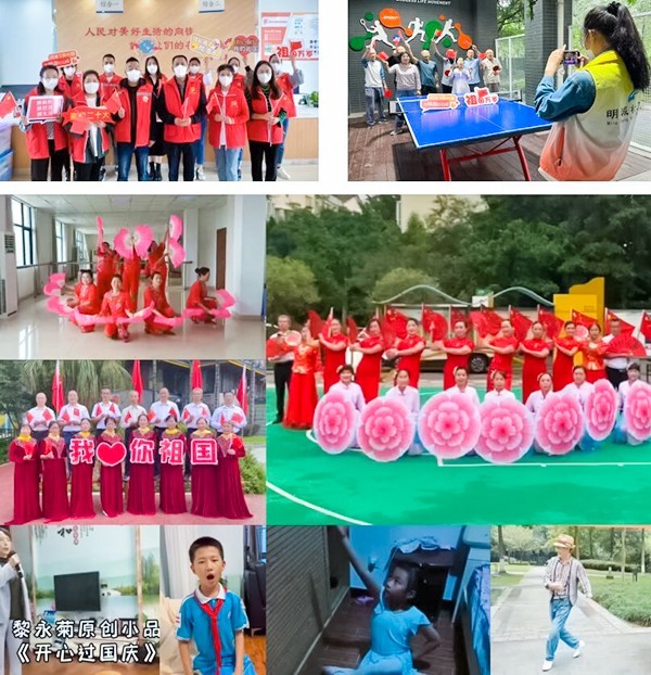 疫情当前,为响应不聚集不扎堆防疫政策,开展线上国庆节目征集活动,此次活动充分展示了光明社区居民的才华与风采。活动海报一经发出,就引来了居民的关注,征集到各种类型的节目8个,居民们的舞姿优美,朗诵铿锵有力,合唱气势磅礴,小品声情并茂,逗得人开怀大笑。所有节目通过线上投票决出一二三等奖,并影响了两千多居民参与效果甚佳。共祝祖国生日, 通过为期一周的视频录制,辖区约有50余名居民参与录制祝福视频,一声声“祝福祖国”在耳边回响,感动万分,居民们都表达了自己对祖国最真挚的祝福。