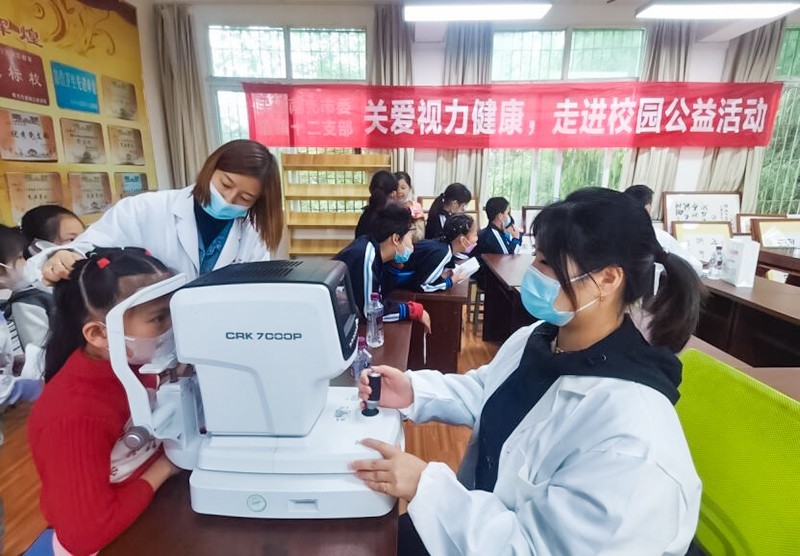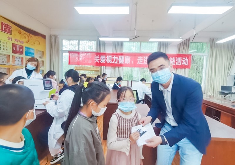 入会积极分子、顺庆区大众眼镜行技术总监刘强率队为全校为100多名学生免费检测视力。