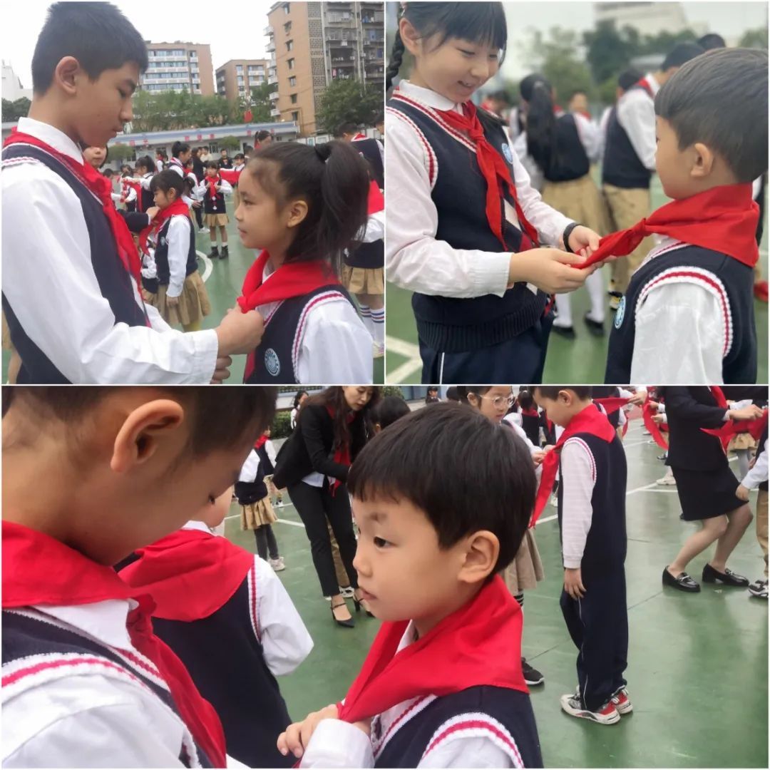 瞧,老队员代表和中队辅导员一起为新队员们授戴象征着光荣和使命的红领巾,仿佛在进行责任的继承、使命的传递。鲜艳的红领巾挂在胸前,是无尚的光荣,责任感和使命感油然而生。