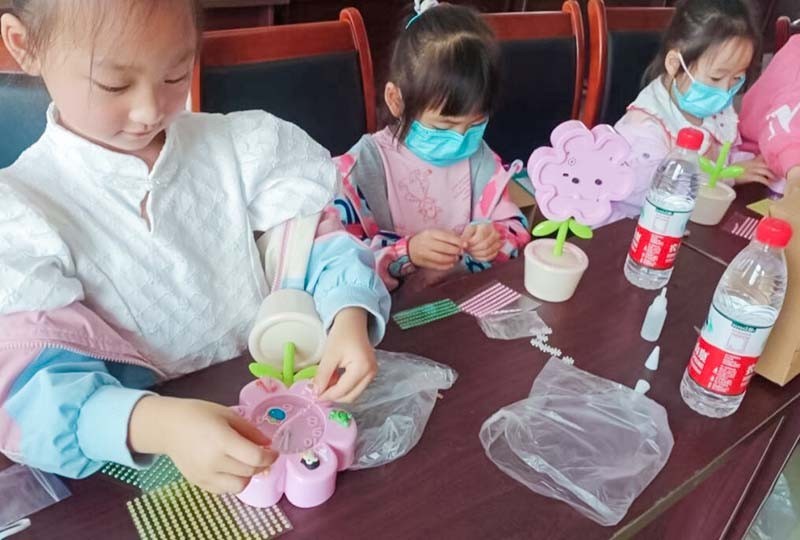 活动开始,社工认真详细地向在场的小朋友讲解了DIY时钟的制作技巧、流程、以及注意事项。随后,将准备的钟表制作材料分发到孩子们的手里,每个孩子认真地对照图片、比对位置、调整时间、组装,粘贴卡通装饰,在制作创意时钟的过程中,他们仔细观察时钟上的刻度、数字、时针和分针,在动手操作中强化理论知识。经过一个小时的创作,一个个造型可爱的卡通花朵时钟完成了。制作完成后,孩子们依次合影拍照。孩子们拿着专属于自己的花朵时钟,露出了灿烂的笑容。