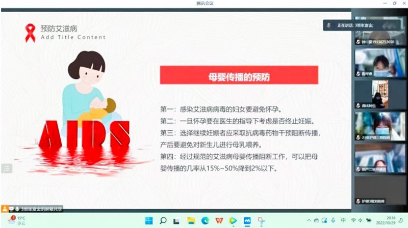 受疫情影响,车水马龙的城市被按下了暂停键,关乎生命健康,没有人能袖手旁观,每个人都是自身健康的第一责任人。为进一步做好艾滋病防治宣传工作,提高在校大学生知艾防艾,正视艾滋,远离艾滋思想意识。10月29日,在四川省南充市高坪区疾病预防控制中心指导下,南充市高坪区志愿者协会组织的《新生“防艾”有一课》线上防艾校园行主题活动顺利进行,240余名来自川北医学院的大一新生积极参与了此次活动。