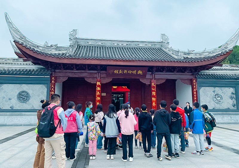 随后,大家来到了一座古庭院建筑风格的现代化川剧艺术博物馆——魏明伦戏剧馆。魏明伦戏剧馆一共有15个展厅,每个厅以魏明伦的经典戏曲命名,其中,令人印象深刻的便是《大戏》沉浸式交互厅,小朋友们的动作可以实时捕捉转化为屏幕上的戏曲形象动作,实现抽象对话。最令人眼前一亮的便是“夕照祁山”主题展厅,孩子们纷纷体验推动石磨,在石磨的转动中跟随大屏幕一起感受日月更替,四季变换。