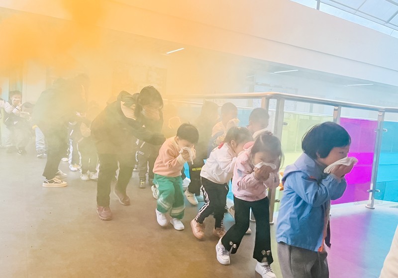 上午10:30左右,幼儿园突然响起防火警报声。在全神贯注地听老师讲课及沉浸自主游戏活动的孩子们在带班老师的指引下快速地拿湿毛巾掩住口鼻,老师们一边带领幼儿逃离火场一边高喊:" 不要怕,不要怕,弯腰前行,保护好自己的安全,有序逃离!"孩子们有惊无险,沿着逃生路线,在危急的信号中有序并快速地逃离现场。各负责人在楼道处及时疏导,并迅速检查各班活动室,确认没有幼儿滞留后也迅速撤离,各班老师立刻清点幼儿人数并将结果报告演练总指挥,整个撤离现场秩序井然,孩子们情绪稳定。