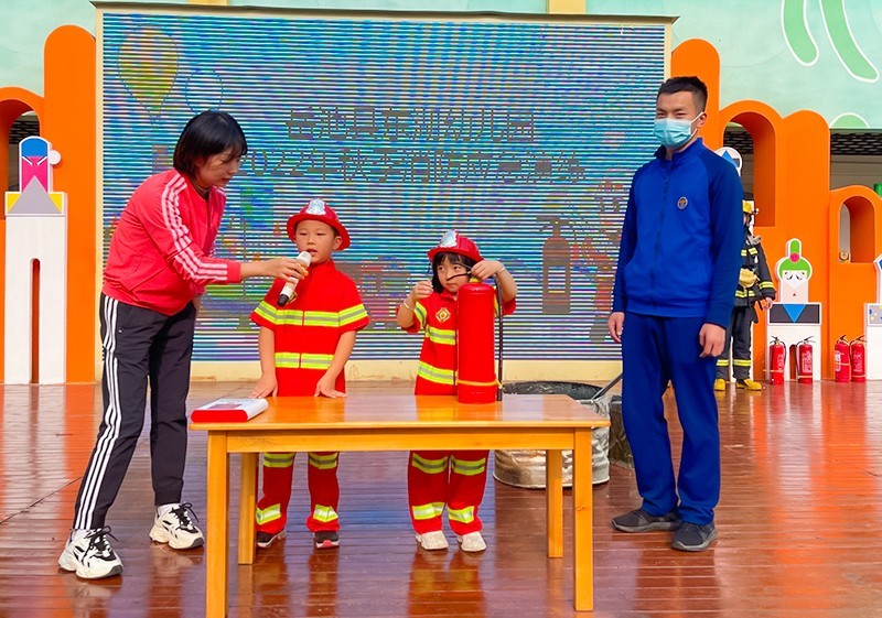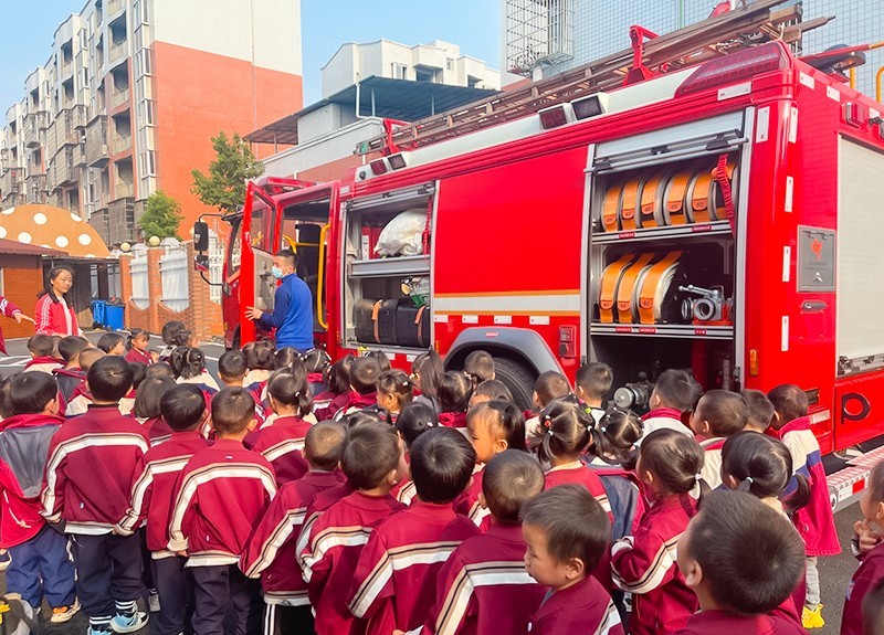 演练结束后,大班的小朋友自告奋勇上台演示灭火器的使用方法,消防员对其进行了点评及夸赞。随后,消防救援队的成员结合孩子们的年龄特点,用通俗易懂的语言,向师生们讲解了火场逃生要领方法和救援服的使用方法。小朋友们还现场体验了如何使用灭火器,让他们真实体验了一把做“消防员”的感觉。当小朋友们看到消防车的时候,再也抵挡不住内心的激动:“哇,消防车竟然藏了这么多秘密!”在消防员叔叔的带领下,小朋友们和消防车来了一次超近距离的接触。