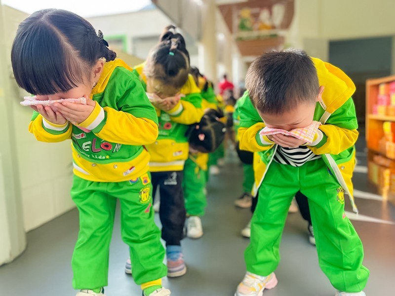 随着消防警报的拉响,演练正式开始了。孩子们在老师的带领下,各班教师迅速按照预案的疏散线路,用湿毛巾捂住口鼻,低姿弯腰前行,沿着指定路线有序撤离到安全地带,随后各班老师迅速维持好秩序,及时清点人数,汇报疏散情况,确保每位幼儿安全撤离,无一人遗漏。