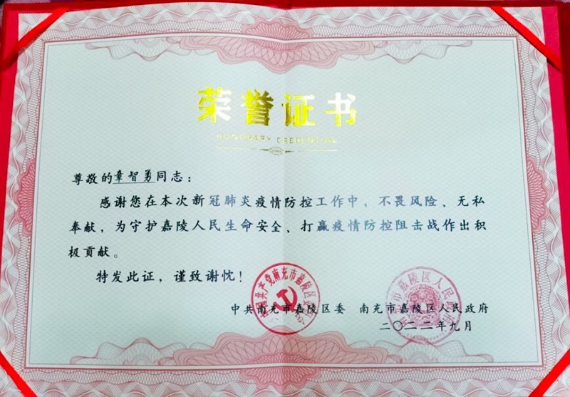 疫情防控取得阶段性胜利后,为感谢民建九支部的无私援助,陈寿路社区为民建九支部赠送一面锦旗,为表彰章智勇无私大爱的奉献精神,嘉陵区委、区政府给章智勇颁发了荣誉证书。(章智勇)