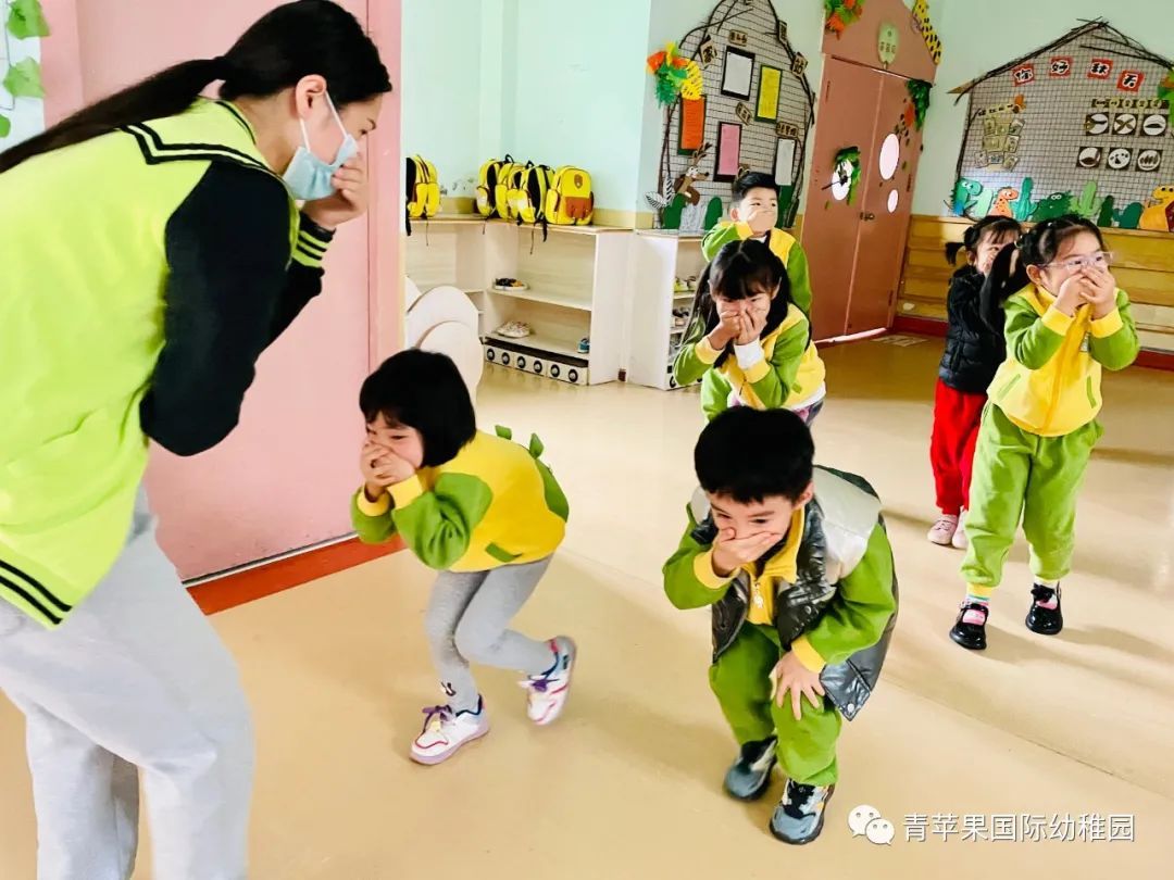 随着“警报声”响起,消防疏散演练开始了。各班教师迅速按照预定疏散路线带领幼儿用湿毛巾捂住口鼻、弯腰俯身、快速有序地撤离到安全地带。