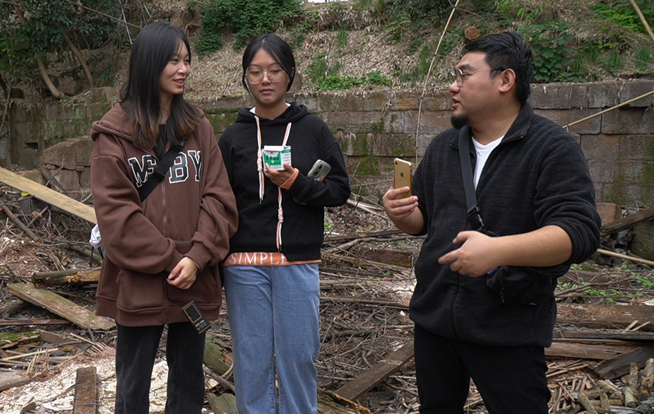 到达平安村后映入眼帘的是一片拆旧留下的瓦砾废墟,这里的房屋大部分都被拆完了,四处都是砖头瓦片。雨后的黄泥路湿滑难行,摄影系的同学们拿着相机和三脚架在坑洼不平的瓦砾中艰难行走,脚下不断地踩碎瓦片的咔嚓声和身旁竹林里传出的鸟叫声交相呼应,同学们仿佛听到了一支天然的奏鸣曲。
