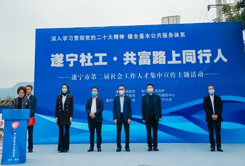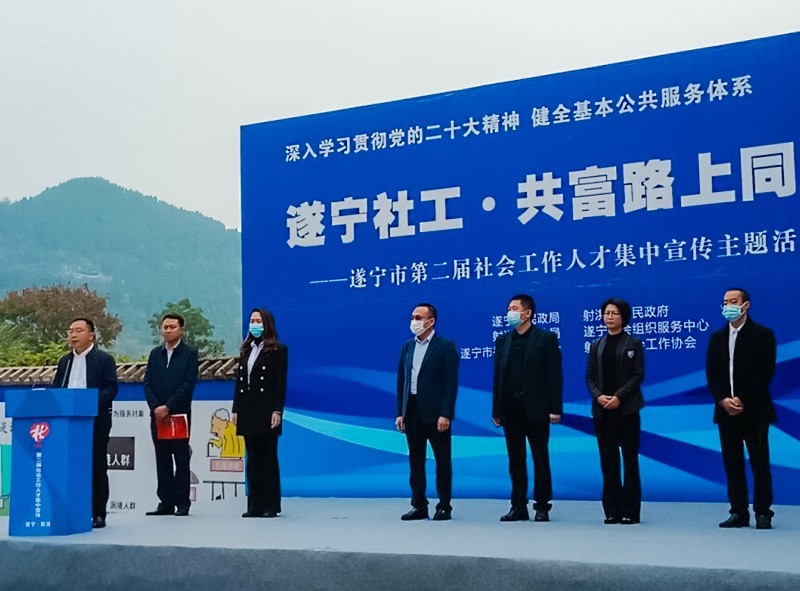 为深入学习贯彻党的二十大精神,健全基本公共服务体系。11月23日上午,四川省遂宁市第二届社会工作人才集中宣传主题活动在射洪市社会组织孵化基地开展。遂宁市政府副秘书长谭恢军,遂宁市委组织部机关党委书记张山东,遂宁市民政局党组成员、市委非公经济和社会组织工委副书记田贵凡,射洪市政府副市长张君,射洪市民政局党组书记、局长王灿,射洪市委组织部机关党委书记夏京出席活动,遂宁市民政局党组书记、局长蒋晟主持活动。