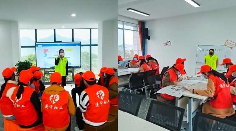 活动过程中,射洪市社会组织孵化基地同步为社工岗开展了小组活动:一是如何用游戏互动提升服务对象在活动中的参与积极性,通过“击鼓传花”的游戏体验让小伙伴们怎样根据不同服务对象设计不同的游戏活动以促进服务对象的积极参与;二是“小组活动设计与带领”第二节,以趣味体验“火眼金睛”引入活动,加强小组人员之间的相互了解与团队协作能力。