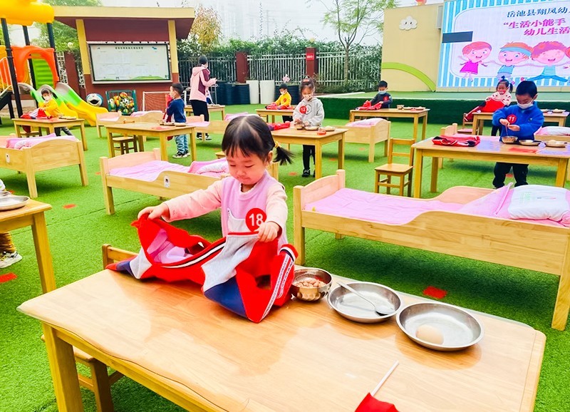 “教育即生活,生活即教育。”为提高幼儿的生活自理能力以及自我服务意识,促进幼儿动手操作能力的发展,养成良好的生活习惯。11月25日,四川省广安市岳池县翔风幼儿园开展了“生活小能手,自理我最棒”幼儿生活自理能力比赛活动。此次活动针对不同年龄阶段幼儿发展水平特点,以幼儿精细动作的发展为核心,提高幼儿的独立动手能力,分别设置了挂衣服、夹花生、整理书包、穿脱鞋子、玩具分类、叠被子、穿衣服、舀花生、剥鸡蛋等比赛项目。