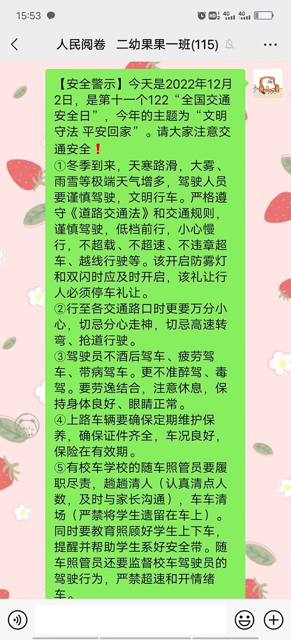 各班老师还根据幼儿的心理需求,充分利用教育资源,以幼儿喜欢的角色扮演游戏,培养幼儿遵守交通规则以及了解交通安全常识,同时还在家长群进行温馨提示,家园联手筑起幼儿交通安全的长城。