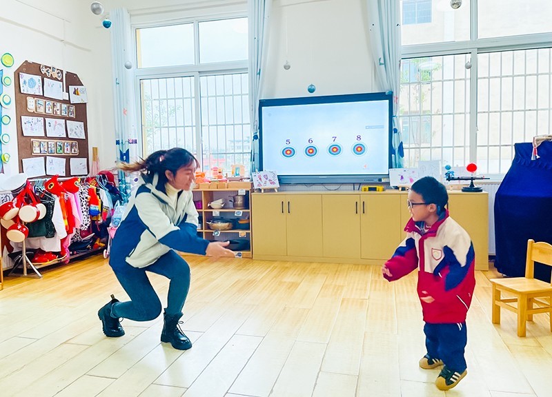 活动中老师创设了轻松愉快的氛围,引导孩子们通过看图谱自信地歌唱、表演,大胆想象创编,在音乐中自由表现,展现出了互动乐学的和谐画面。张琳老师的艺术活动《你开枪我来躲》借助音乐与孩子们玩了一场有趣的战斗游戏。孩子们在最喜欢的游戏中倾听感知音乐,大胆表现,体验音乐游戏带来的快乐,课堂氛围紧张动感而富有乐趣。