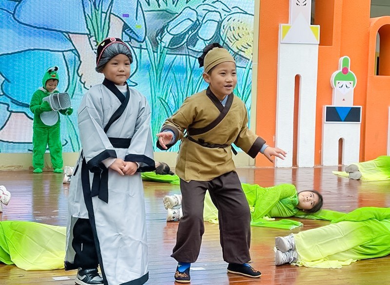 老师们将幼儿熟知的经典故事与快板、三句半等表演形式相结合进行编排,在小朋友的精彩演绎下,《神笔马良》、《巧借芭蕉扇》、《老鼠嫁女》、《不好了 狼狼狼来了》等经典故事呈现在众人眼前。孩子们用夸张的动作、可爱的表演、生动的讲述赢得了在场观众阵阵的笑声和欢呼声。