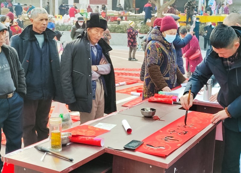 活动当天恰好正值赶集,现场热闹非凡,尽管天气寒冷也没有减少大家对活动的热情,大家都积极报名踊跃参加写春联,县书法家协会的老师们在现场下笔,苍劲有力,笔走龙蛇,根据居民们的不同需求写出了各种寓意和吉祥祝福的春联,居民们依次有序地将春联放在地上晾晒,并且高兴的守在春联旁边,每个人的脸上都洋溢着幸福的笑容。