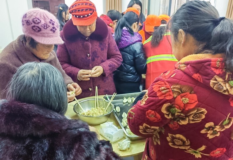 “动手”环节,居民朋友们一起动手,剁馅、调料、包饺子……经过阿姨们的巧手,一个个饱满的、形状各不相同的饺子逐渐呈现在大家面前,阿姨们都开玩笑说这是“百家饺”。