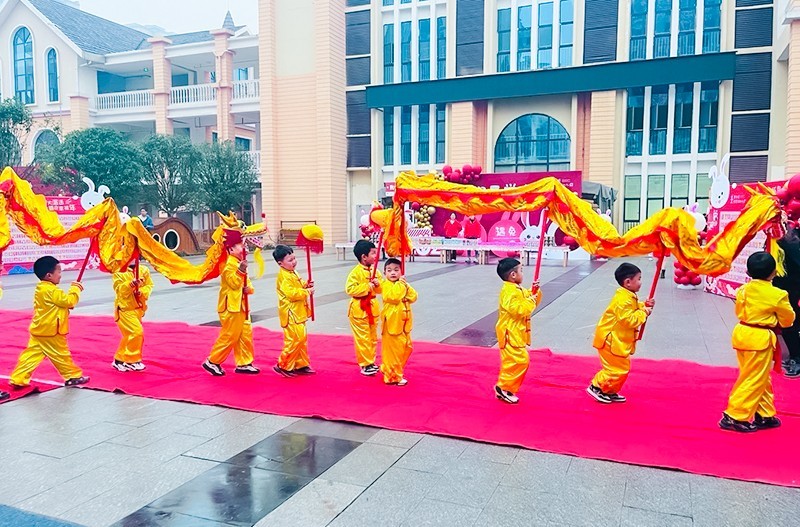 随后,庄严的升旗仪式拉开了新学期的帷幕。身穿红色裙子的老师们跳了《新年舞》、活泼欢快的《兔子舞》,大班孩子们还表演了中华民族的传统文化活动《舞龙》。