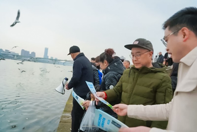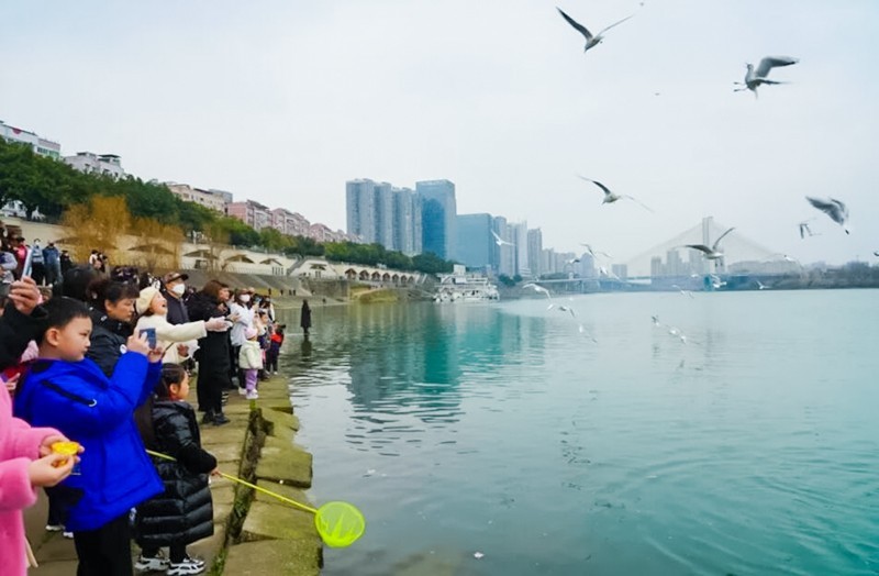 “市民朋友们,我们为大家准备了喂鸟常识手册和鸟食,大家可以到我这里免费领取……”工作人员向市民发放了2000余份宣传单和大量鸟食,耐心细致地向市民科普并示范投喂野生鸟类的方法技巧,讲解注意事项。市民在活动方的引导下进行投喂,引来近百只红嘴鸥在江面上翩然起舞戏清波,呼朋引伴觅食忙……