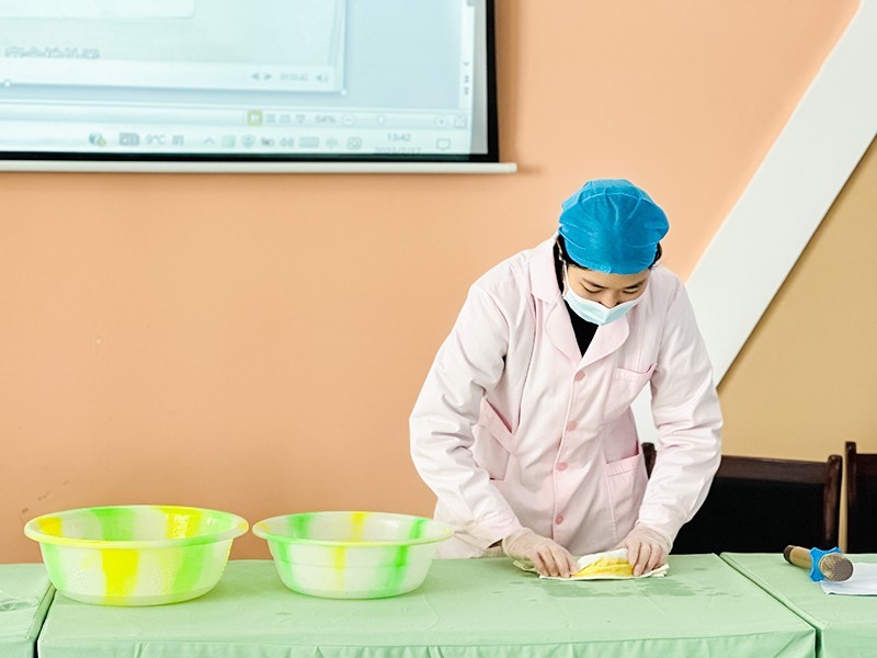 保健医生主要对春季高发的流行性感冒、水痘、腮腺炎、手足口病以及诺如病毒等传染病的传染源、传播途径、主要症状、潜伏期、隔离期、预防措施进行了详细讲解。同时该园保健医生对"呕吐物"的规范处置操作流程进行了演示,着重讲解了注意事项、消毒液的配比、环境消毒、个人防护用品的处理等内容,强化了教师们正确处置呕吐物的实操技能。