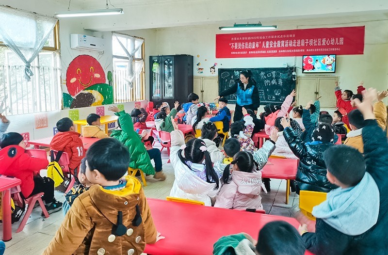为提高儿童安全意识和自我保护意识,普及烧烫伤安全知识和急救能力,切实保护儿童远离意外伤害,2月24日上午,由四川省民政厅支持,自贡市民政局、大安区民政局指导,大安区大安街道办事处主办,自贡市灵志社会工作服务中心承办的自贡市大安区大安街道2022年社会工作服务试点示范项目——“不要烫伤我的童年”儿童安全教育活动在扇子坝社区爱心幼儿园圆满结束。