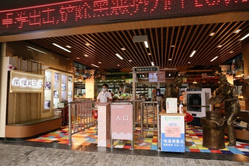 为应对农贸市场人流量高峰期密集涌入,消费者、经营户需同时监管的现状,现代菜篮子创新研制了农贸防疫智控道闸系统,实施物流和人流分离、入场和出场分离的双分离管控。系统标配含:入口侧体温安检门禁,采用AI(人工智能)集成算法实现通道监控、安全保护、防止尾随及语音警示等功能,通过无接触红外传感使通行效率达到300-500人/刻钟,动态环境补偿技术让体温检测精准度控制在±0.3℃;出口侧单向道闸,实现出入人流物理分离,避免了人流交叉的管控风险;中间设无障碍专用通道,提供特定人员的通行方便;此外,还配置客流监控、遮阳棚、顶棚、一米间隔提示、消毒地毯等,形成立体式、多层次的卡口技防管控系统,并制订出台了技术标准,大大提升了市场的服务效率,并缩短消费者入场防疫侯检时间,提升通行效率,优化购物体验。现代菜篮子还对旗下运营的农贸市场分批加装空调和新风系统,对市场空气湿度、温度、浑浊度进行控制,抑制病菌滋生;同步组织研发市场身份验证访客系统,继续提升市场防控能力、强化追踪,为稳固战疫的战略成果不断提供战术加持。