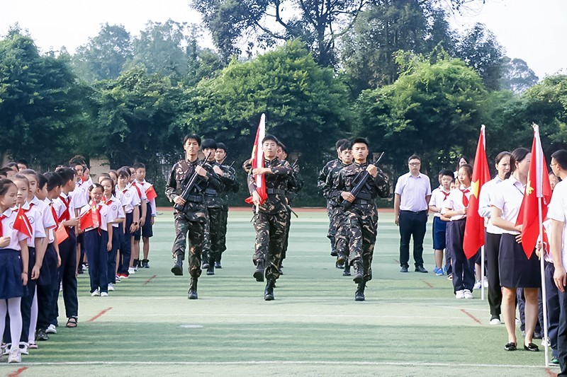 伴随着四川大学锦江学院大学生国旗护卫队队员那飒爽的英姿、铿锵有力的步伐,彭山四小“国庆献礼”主题活动拉开了帷幕,雄壮而嘹亮的国歌,抒发了全体师生对五星红旗的致敬,诠释了对祖国深情的爱,激起了为中华之崛起而读书的豪情。